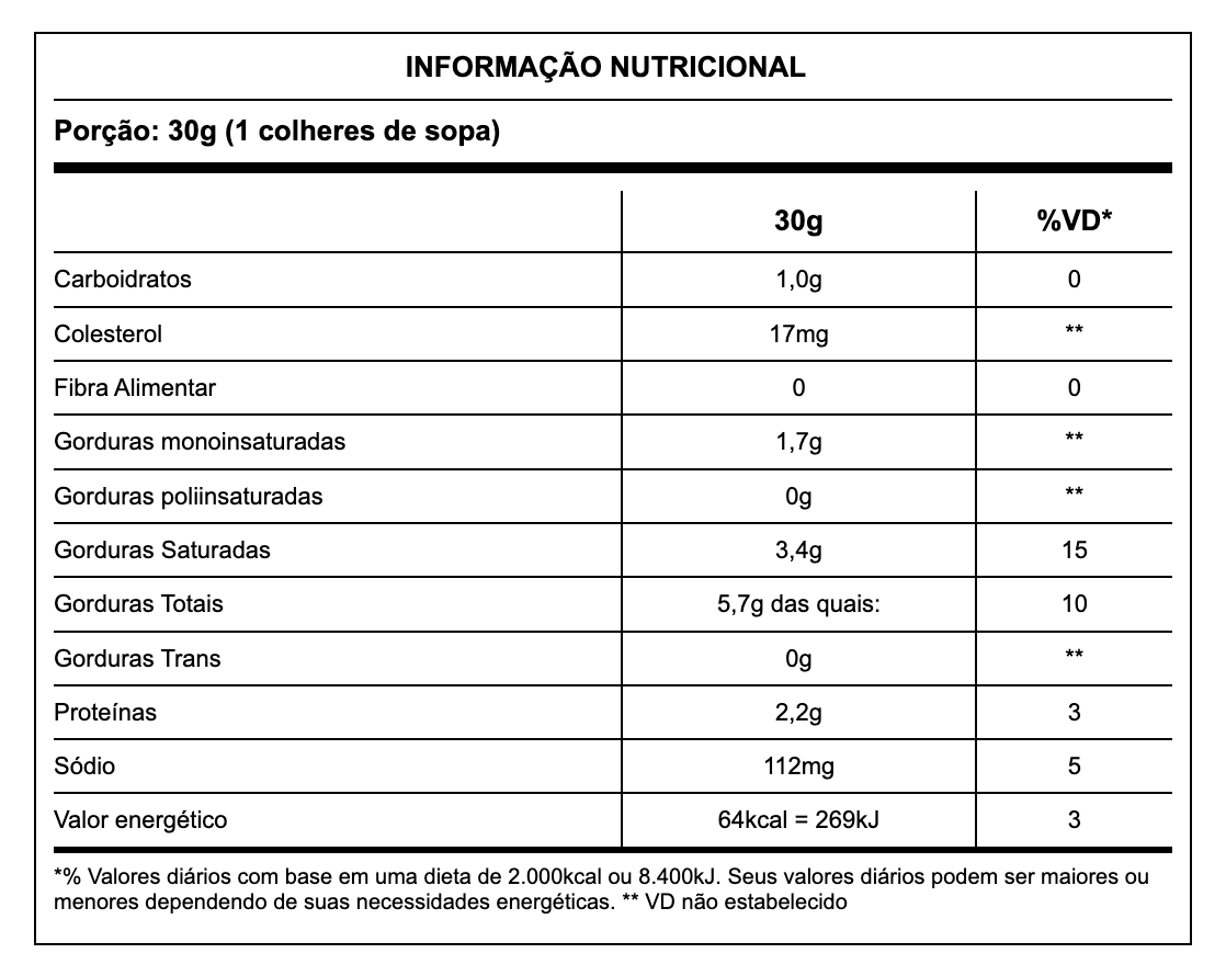 Creme de leite, leite desnatado, concentrado proteico de leite, sal (cloreto de sódio), fermento lácteo, espessantes goma xantana e carragena, conservador sorbato de potássio e estabilizante carboximeticelulose sódica. Alergênicos: Leite e derivados.