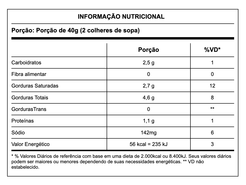 Leite integral e/ou leite integral reconstituído, creme de leite, cloreto de sódio (sal), farinha de trigo enriquecida com ferro e ácido fólico, tempero preparado sabor carne [cloreto de sódio (sal), maltodextrina, gordura animal, especiarias: sálvia, salsa, cebola, louro e alho e aroma idêntico ao natural de carne], mix de aditivos (amido modificado e espessantes carragena INS 407, carboximetilcelulose sódica INS 466, goma tara INS 417 e goma xantana INS 415) e estabilizante fosfato dissódico INS 339ii. Alergênicos: Contém: Leite e derivados, derivados de trigo e soja. Contém: Lactose. Pode conter: centeio, cevada e aveia. Contem Glúten